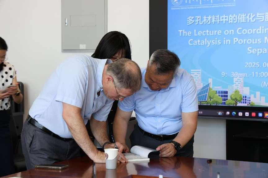 讲座结束后,Rothenberg教授向学院领导赠送了本人编著的中文版《催化原理与绿色应用》(第二版)教材,以表达对领导的诚挚感谢。在随后的座谈会上,学院领导与两位教授就联合申报国际合作项目、开展师生互访交流等合作事 宜进行了深入探讨。最后,与会代表与两位专家合影留念。此次讲座的成功举办,不仅为师生带来了国际前沿的学术视角,更开辟了学校与国际顶尖科研团队合作的新路径。